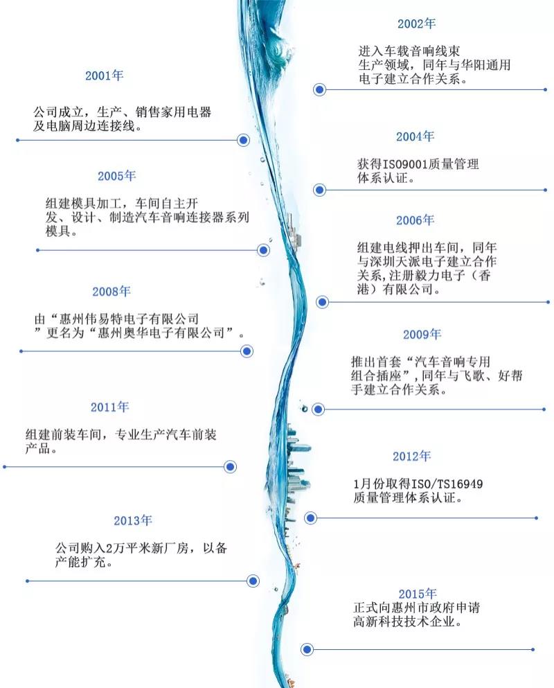 惠州奧華電子有限公司成立于2001年,公司占地面積10000平方米,建筑面積12000平方米,員工600余人。擁有一批優(yōu)秀的研發(fā)、技術(shù)、生產(chǎn)管理人才。專業(yè)開發(fā)、生產(chǎn)、銷售汽車插座、線束、精密連接器等汽車部件。具有汽車連接器全程制造能力,包括精密模具、塑膠成型、五金沖壓、電線電纜、零部件及線束生產(chǎn)。公司產(chǎn)品已廣泛應用于汽車音響、空調(diào)、防盜器、GPS導航、天窗、倒車雷達、電動門窗、儀表等汽車電子行業(yè),并與國內(nèi)外電子企業(yè)建立了良好的合作伙伴關(guān)系。