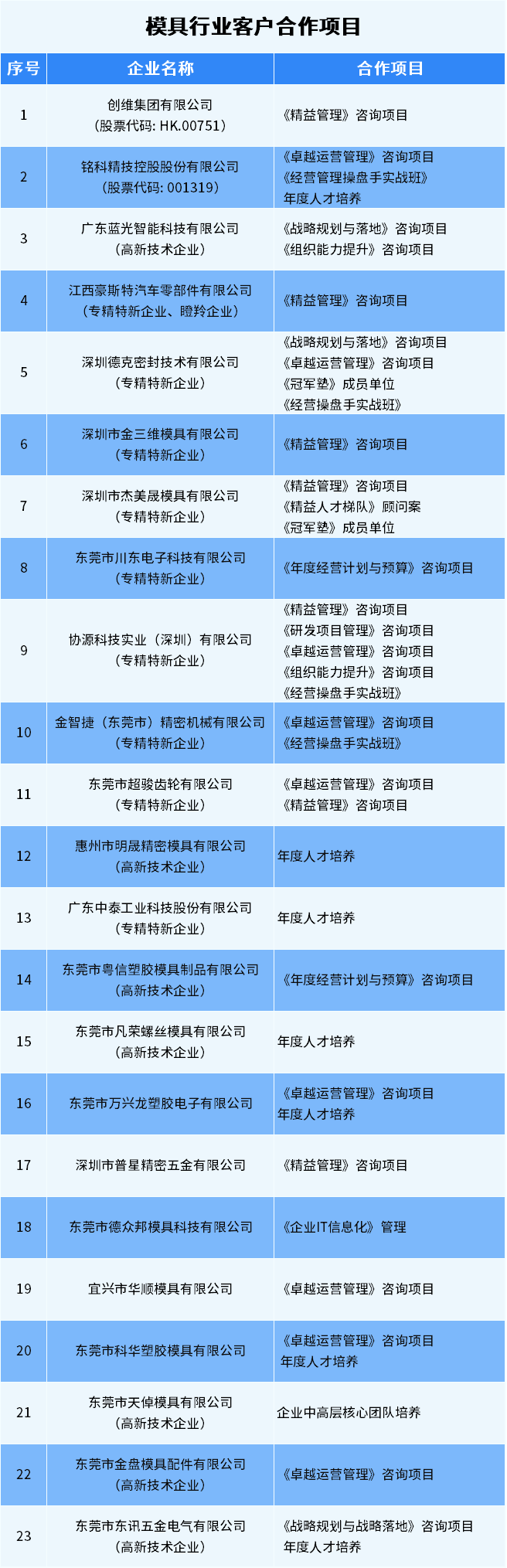 遠(yuǎn)大方略精準(zhǔn)剖析模具行業(yè)發(fā)展現(xiàn)狀和痛點(diǎn),為眾多模具企業(yè)賦能,持續(xù)開展針對性咨詢項(xiàng)目: