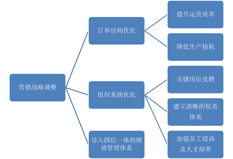 3、對營銷戰(zhàn)略進(jìn)行梳理,并配套以訂單結(jié)構(gòu)優(yōu)化、組織系統(tǒng)優(yōu)化、績效體系導(dǎo)入,最終實現(xiàn)戰(zhàn)略營銷破局。