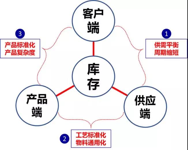 從企業(yè)的運營角度看,客戶、產(chǎn)品、供應(yīng)決定運營的復(fù)雜度,直至庫存的復(fù)雜度。舉例:保證供需平衡、縮短交付周期,可有效的降低安全庫存持有量;如產(chǎn)品和工藝設(shè)計通用化及標(biāo)準(zhǔn)后,產(chǎn)品生產(chǎn)難度就會降低,生產(chǎn)周期就縮短,相應(yīng)的庫存就下降。