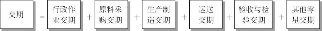 (1)行政作業(yè)交期。行政作業(yè)所包含的時間是采購方與供應(yīng)商之間共同為完成采購行為所必須進(jìn)行的文書及準(zhǔn)備工作。采購方包括選擇或開發(fā)供應(yīng)商、準(zhǔn)備采購訂單、取得采購授權(quán)、簽發(fā)訂單等。供應(yīng)商包括訂單進(jìn)入生產(chǎn)流程、確認(rèn)庫存、客戶信用調(diào)查、生產(chǎn)能力分析等。