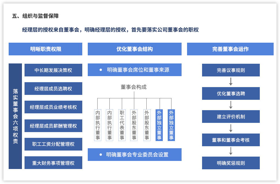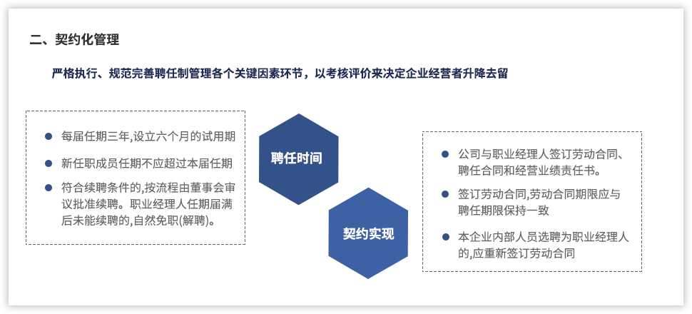 職業(yè)經(jīng)理人改革的核心目的是自上而下地為企業(yè)建立市場(chǎng)化的經(jīng)營(yíng)機(jī)制和激勵(lì)約束機(jī)制,推動(dòng)國(guó)有企業(yè)市場(chǎng)主體地位的落實(shí),增強(qiáng)、釋放企業(yè)發(fā)展活力和潛力。遠(yuǎn)大方略認(rèn)為,職業(yè)經(jīng)理人改革是一個(gè)體系工程,其實(shí)施需要以公司治理結(jié)構(gòu)完善為先決條件,以人才發(fā)展體制機(jī)制改革為制度基礎(chǔ),以契約化管理和有效的考核、激勵(lì)、約束機(jī)制作為保障,涵蓋戰(zhàn)略引導(dǎo)、治理機(jī)制、崗位價(jià)值、薪酬策略、激勵(lì)前設(shè)、契約管理等多個(gè)方面。