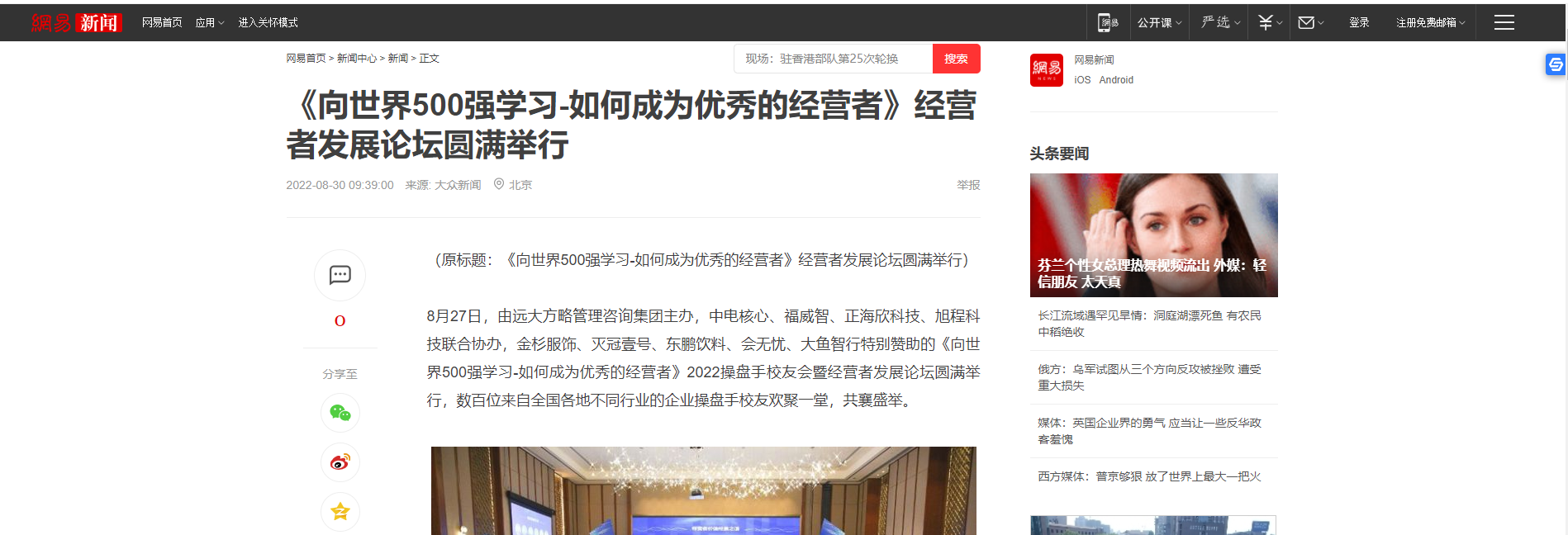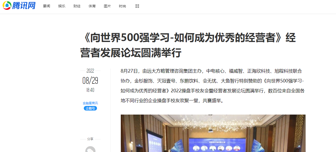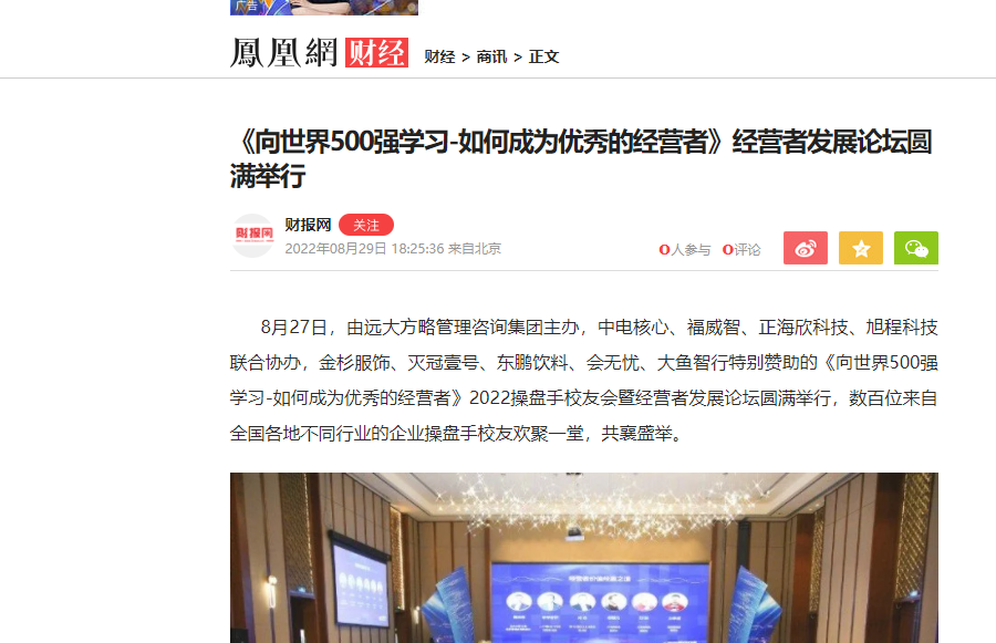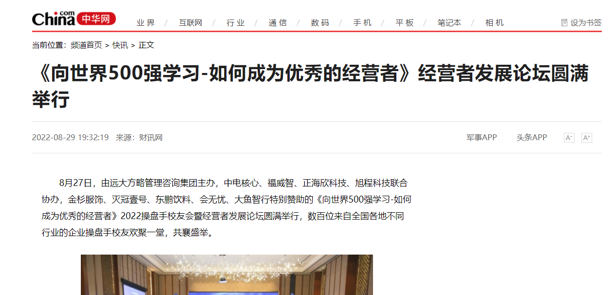 8月27日,由遠(yuǎn)大方略管理咨詢集團(tuán)主辦,中電核心、福威智、正海欣科技、旭程科技聯(lián)合協(xié)辦,金杉服飾、滅冠壹號、東鵬飲料、會無憂、大魚智行特別贊助的《向世界500強(qiáng)學(xué)習(xí)-如何成為優(yōu)秀的經(jīng)營者》2022操盤手校友會暨經(jīng)營者發(fā)展論壇圓滿舉行,數(shù)百位來自全國各地不同行業(yè)的企業(yè)操盤手校友歡聚一堂,共襄盛舉。