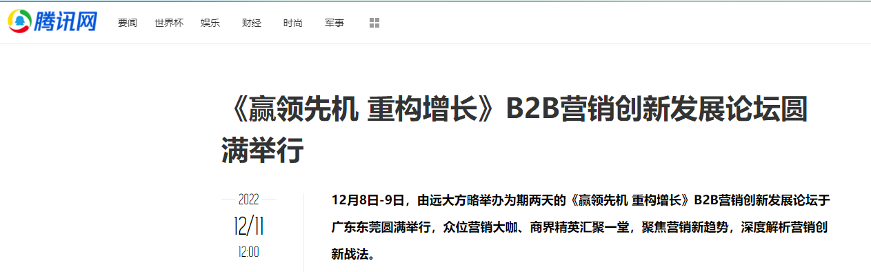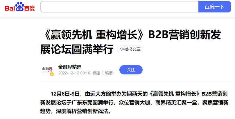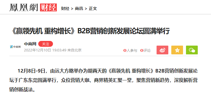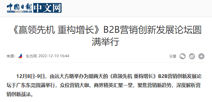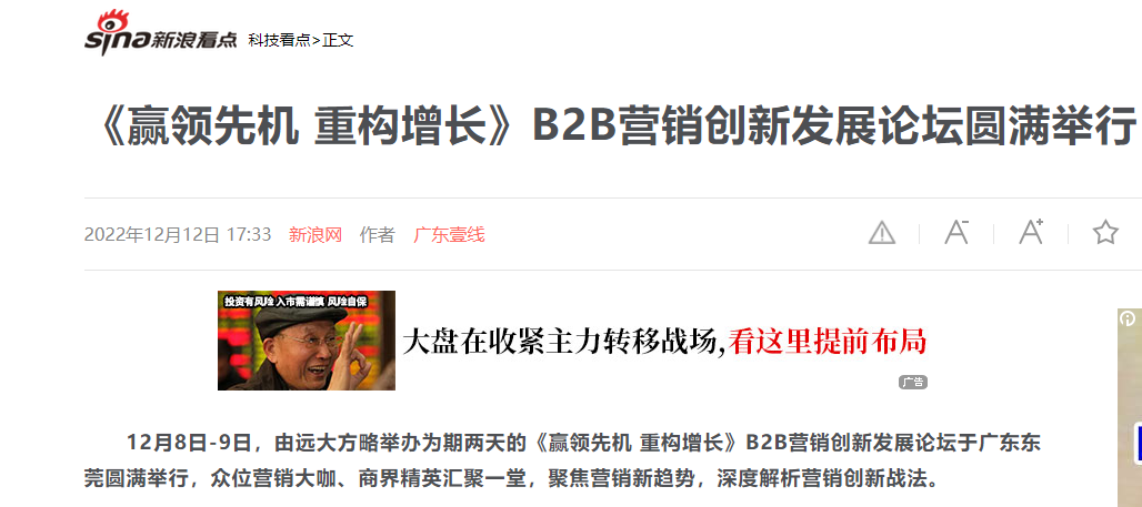 12月8日-9日,由遠(yuǎn)大方略舉辦為期兩天的《贏領(lǐng)先機(jī) 重構(gòu)增長(zhǎng)》B2B營(yíng)銷創(chuàng)新發(fā)展論壇于廣東東莞圓滿舉行,眾位營(yíng)銷大咖、商界精英匯聚一堂,聚焦?fàn)I銷新趨勢(shì),深度解析營(yíng)銷創(chuàng)新戰(zhàn)法。