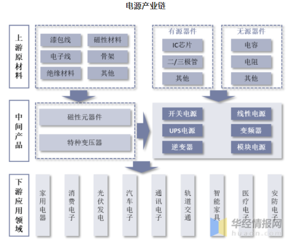 電源產(chǎn)業(yè)鏈主要包括上游原材料、中游中間產(chǎn)品及電源制造、下游應(yīng)用領(lǐng)域。原材料供應(yīng)商主要為電源制造商提供控制芯片、功率器件、變壓器、PCB板等電子器件;中游電源制造商進(jìn)行電源產(chǎn)品研發(fā)和生產(chǎn),并通過各種營銷渠道對產(chǎn)品進(jìn)行銷售和提供相應(yīng)的售后服務(wù),并負(fù)責(zé)根據(jù)行業(yè)用戶對相關(guān)產(chǎn)品的需求,采購相應(yīng)型號、規(guī)格的電源產(chǎn)品,應(yīng)用到相應(yīng)的電子設(shè)備中,并提供設(shè)備的技術(shù)支持和售后服務(wù);下游應(yīng)用領(lǐng)域廣泛,主要包括新能源汽車,通信電源,以及軍工等領(lǐng)域。