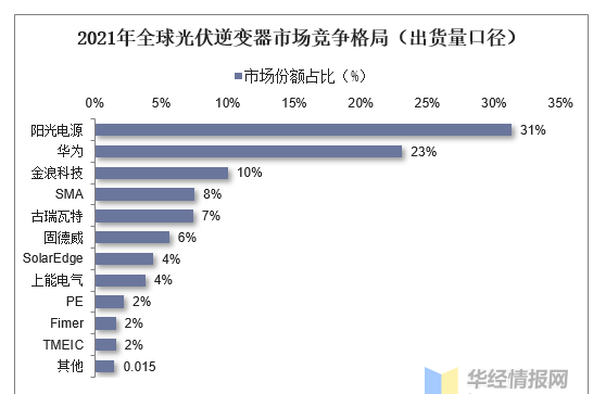 就光伏逆變器市場競爭格局而言,2021年全球逆變器出貨量排名前10的廠商中,中國企業(yè)占了6家,分別是華為、陽光電源、古瑞瓦特、錦浪科技、上能電氣和固德威。其中,陽光電源以31.3%的市占率排名第一,行業(yè)集中度進(jìn)一步提升,占比市場份額持續(xù)提升。