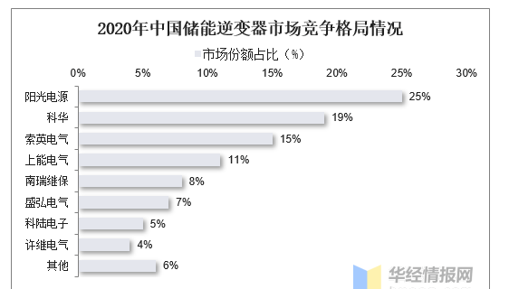 從儲能逆變器市場競爭格局來看,目前我國龍頭企業(yè)是陽光電源,主要從光伏逆變器領(lǐng)域切入,有一定先發(fā)優(yōu)勢,目前在海內(nèi)外市場都排名第一,2020年國內(nèi)儲能逆變器市占率達(dá)到了20.4%。