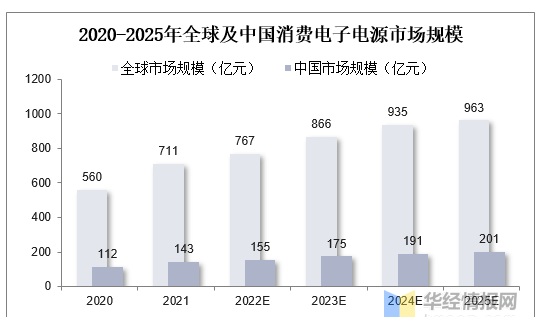 消費電子電源主要包括用于給手機(jī),智能穿戴設(shè)備,智能家居等智能終端產(chǎn)品充電的電源,未來將隨下游產(chǎn)品更新?lián)Q代周期縮短以及新型應(yīng)用領(lǐng)域不斷出現(xiàn)而穩(wěn)定增長。從消費電子電源市場來看,預(yù)計至2025年全球消費電子電源市場規(guī)模將達(dá)962.67億元,2020-2025年CAGR達(dá)11.44%,其中手機(jī)電源,PC及PAD電源,智能可穿戴電源,智能家居電源市場規(guī)模分別達(dá)440億元,246億元,80億元,196億元;至2025年中國消費電子電源市場規(guī)模將達(dá)201億元,2020~2025年CAGR達(dá)12.35%,其中手機(jī)電源,PC及PAD電源,智能可穿戴電源,智能家居電源市場規(guī)模分別達(dá)86億元,41億元,22億元,52億元。