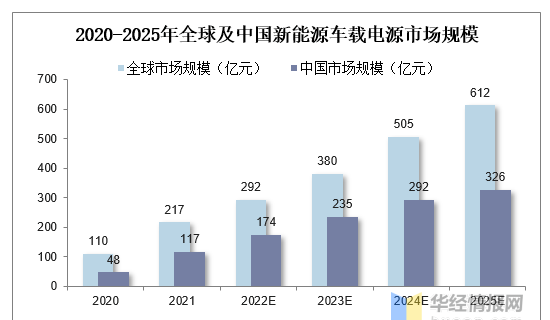 車載電源主要包括車載充電機(jī)OBC和車載DC-DC轉(zhuǎn)換器,其中OBC的作用是將市電交流輸入轉(zhuǎn)換為電動汽車動力電池所需的直流,為動力電池充電;車載DC-DC轉(zhuǎn)換器則是將電動汽車動力電池的高壓轉(zhuǎn)換為12V或24V低壓,為車上低壓蓄電池等設(shè)備供電。從新能源車載電源市場規(guī)模來看,預(yù)計至2025年全球新能源車電控市場規(guī)模將達(dá)1114億元,2020-2025年CAGR為41%,其中MCU達(dá)783億元,VCU達(dá)70億元,BMS達(dá)261億元;全球車載電源市場規(guī)模達(dá)612億元,2020~2025年CAGR達(dá)41%。至2025年中國新能源車電控市場規(guī)模將達(dá)594億元,2020~2025年CAGR達(dá)47%;中國車載電源市場規(guī)模達(dá)326億元,2020-2025年CAGR達(dá)47%。