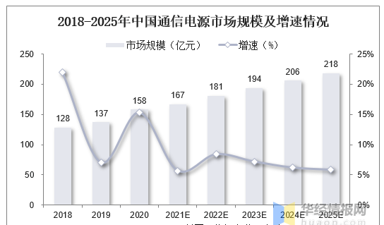 通信設(shè)備領(lǐng)域是電源的重要應(yīng)用領(lǐng)域之一。通信電源為基站通信設(shè)備、光通信網(wǎng)絡(luò)設(shè)備、寬帶通信設(shè)備、程控和網(wǎng)絡(luò)交換機(jī)、環(huán)境及監(jiān)控設(shè)備等提供電源保障。從通信領(lǐng)域電源市場規(guī)模來看,根據(jù)中國電源學(xué)會統(tǒng)計,2020年我國通信電源市場規(guī)模達(dá)150億元。隨著全球5G建設(shè)的加速推進(jìn),2025年我國電源市場規(guī)模有望達(dá)到218億元。