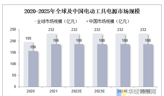 電動工具電源市場保持穩(wěn)定,具體來看,預(yù)計至2025年全球電動工具市場規(guī)模將達(dá)232億元,2020-2025年CAGR達(dá)3.51%,中國電動工具市場規(guī)模將達(dá)186億元,2020-2025年CAGR達(dá)3.51%。