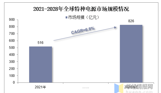 特種電源是指具有不同于普通電源的特殊指標(biāo)(如高壓輸出、特大電流輸出、脈沖輸出等)和特殊用途的電源裝置。據(jù)NT Cysd數(shù)據(jù),2021年全球軍用電源市場規(guī)模大約為516億元,預(yù)計2028年將達(dá)到826億元,2022-2028期間年復(fù)合增長率為6.8%。