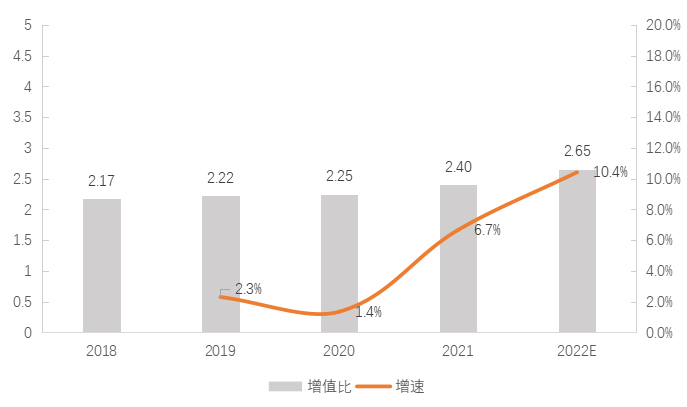 食材加工市場規(guī)模達到10.5萬億元,主要類別有:肉類、蛋類、奶及奶制品、蔬菜類、水果、水產(chǎn)品、谷物等,綜合加工增值比為2.4:1,相比十三五初期(2016年)的產(chǎn)值增值比2.1:1有著重大突破,如圖3-4,3-5所示?;诖粟厔?,2022年食材加工市場增值比增速將突破2位數(shù),然而因受到疫情影響,能否成功突破2位數(shù)有諸多不確定因素。
