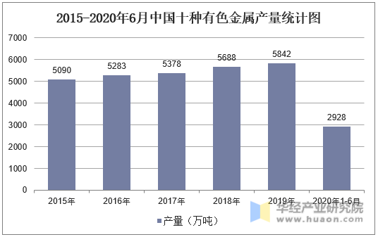2015-2020年6月中國(guó)十種有色金屬產(chǎn)量統(tǒng)計(jì)圖