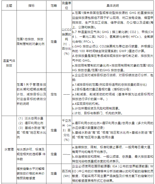 煤炭作業(yè)產(chǎn)業(yè)包括開采煤炭的企業(yè)和制造煤炭產(chǎn)品的企業(yè),開采活動分為地下開采和露天開采,開采對象分為普通煤和原料煤。煤炭行業(yè)屬于資源密集型,作業(yè)過程直接產(chǎn)生較多溫室氣體。該準(zhǔn)則要求相關(guān)企業(yè)在溫室效應(yīng)煤煙排放方面對溫室氣體排放量進(jìn)行直接披露,并對企業(yè)短期、長期的減排計劃與目標(biāo)按要求進(jìn)行信息披露。對水資源的管理主要側(cè)重于對水的循環(huán)利用、合規(guī)利用方面的披露。儲備評估及資本支出方面?zhèn)戎赜趯γ禾慨a(chǎn)業(yè)未來氣候相關(guān)影響的預(yù)測。此外,針對煤炭行業(yè)的開采對象,該準(zhǔn)則還要求對普通煤生產(chǎn)量(百萬噸)和原料煤生產(chǎn)量(百萬噸)進(jìn)行披露。
