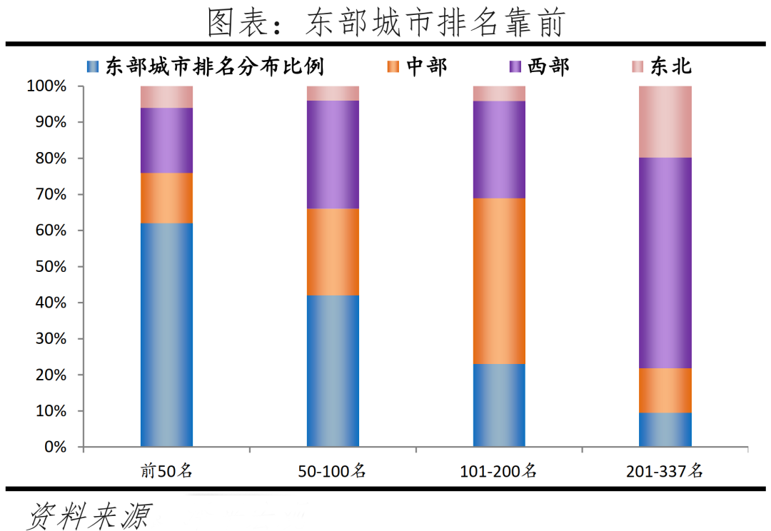 1)分地區(qū)看,發(fā)展?jié)摿OP50城中南方城市占據(jù)36城,力壓北方;東部地區(qū)城市占據(jù)31席,領(lǐng)先于其他三大地區(qū);而東北地區(qū)僅3城位于TOP50,75%城市為200名之后,經(jīng)濟不景氣制約其房地產(chǎn)市場發(fā)展。