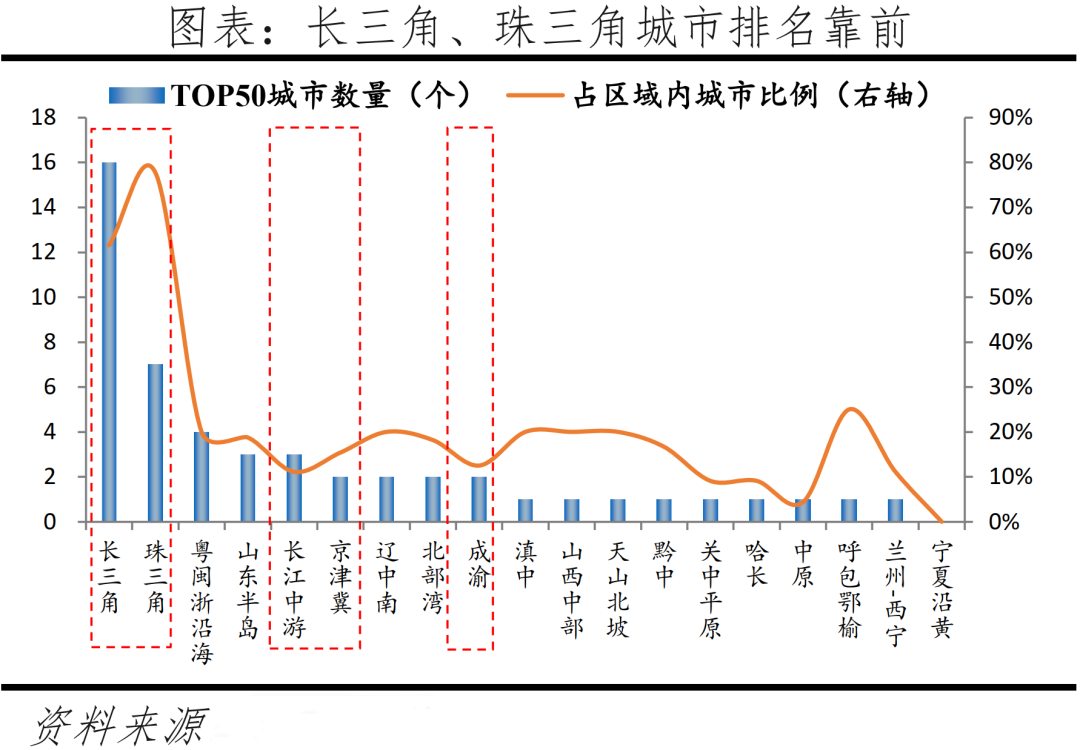 在發(fā)展?jié)摿OP50城中長三角、珠三角、京津冀、長江中游、成渝城市群內(nèi)城市數(shù)量分別為16、7、2、3、2個,占區(qū)域城市總量比例分別為61.5%、77.8%、15.4%、11.1%、12.5%,長三角、珠三角城市群起步較早,發(fā)展相對成熟,資源集聚能力較強,區(qū)域城市總體排名靠前。