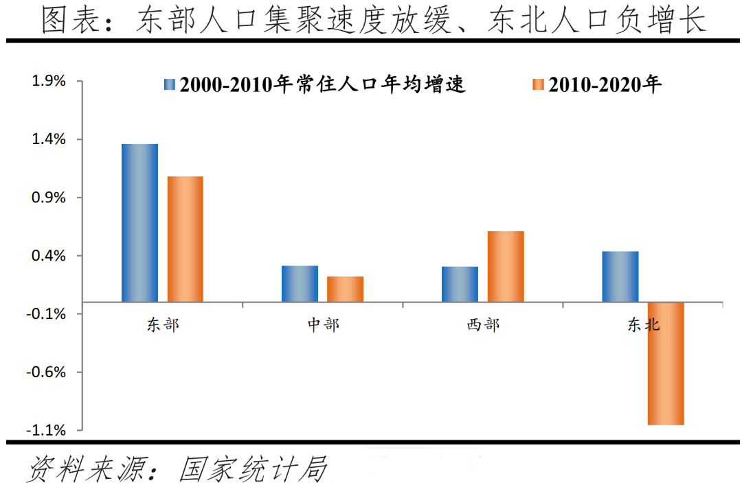 2010年以來,隨著沿海地區(qū)產(chǎn)業(yè)轉(zhuǎn)型升級、中西部地區(qū)產(chǎn)業(yè)承接以及老一代農(nóng)民工老化,部分人口逐漸回流中西部,東部人口增速總體減緩,而東北地區(qū)人口開始負增長。