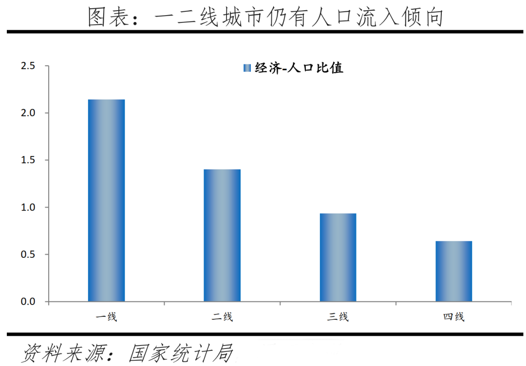 經(jīng)濟-人口比值方面,一線、二線、三線、四線城市的經(jīng)濟-人口比值分別為2.1、1.4、0.9、0.6。