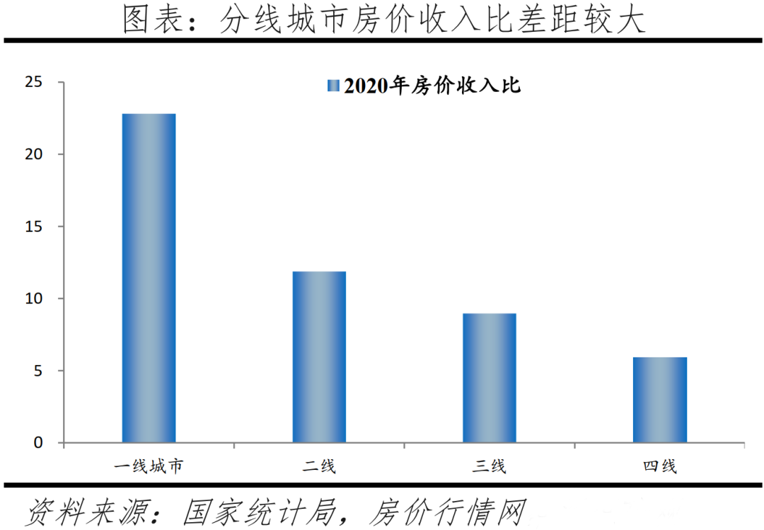 房價收入比方面,2020年一線、二線、三線、四線城市房價收入比分別為22.8、11.9、9.0、5.9,城市間分化顯著,這與全球其他經(jīng)濟體核心城市房價收入比較高的情況一致。