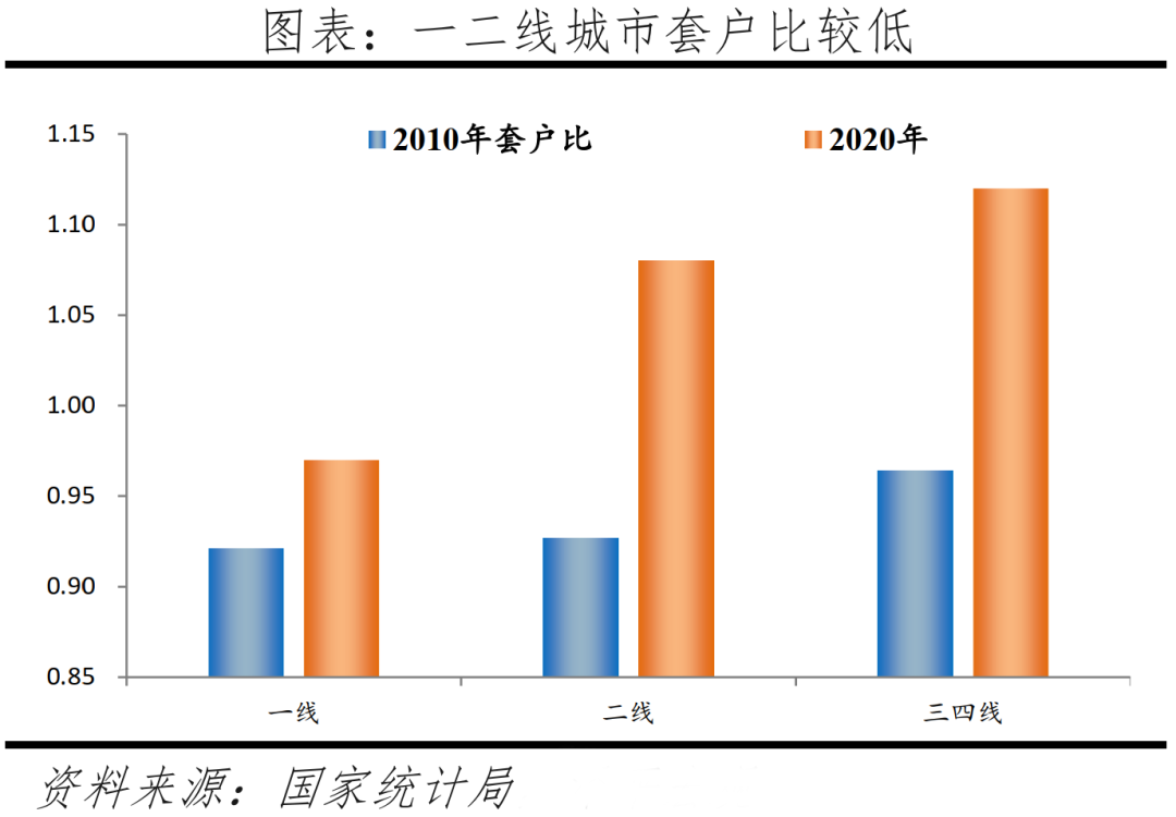 當前一二線住房供給偏緊,套戶比分別為0.97、1.08,中部和東北地區(qū)相對過剩,套戶比分別為1.10、1.13。
