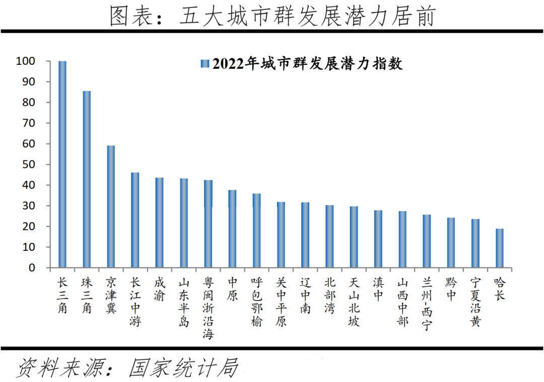 其中,五大城市群以全國13%的土地集聚了47.8%的人口,創(chuàng)造了60.3%的GDP,成為帶動中國經(jīng)濟高質(zhì)量發(fā)展的主要平臺。從發(fā)展?jié)摿ε琶Y(jié)果看,長三角、珠三角房地產(chǎn)投資潛力指數(shù)遙遙領(lǐng)先,其次是京津冀、長江中游、成渝城市群,之后是山東半島、粵閩浙沿海、中原等城市群。