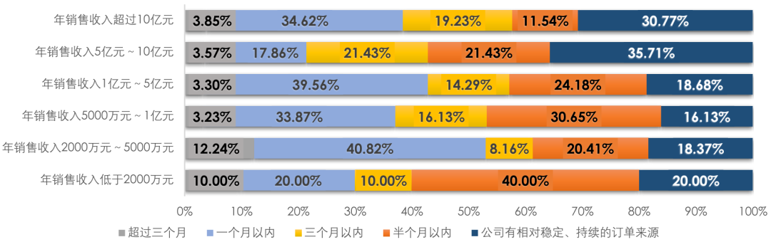 企業(yè)在手訂單方面,26.4%的受訪企業(yè)擁有相對穩(wěn)定、持續(xù)的訂單來源或在手訂單能夠支持三個月以上的生產(chǎn),而34.4%的受訪企業(yè)在手訂單僅能夠支撐企業(yè)一個月以內(nèi)的生產(chǎn)。根據(jù)企業(yè)規(guī)模,大中型企業(yè)的在手訂單更加穩(wěn)定、充足,能夠支持更長時間的生產(chǎn);而小微企業(yè)的在手訂單大多只能夠支撐一個月以內(nèi)甚至半個月以內(nèi)的生產(chǎn)(圖2)。