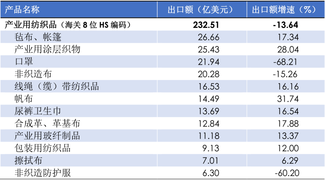 2022年1~6月產(chǎn)業(yè)用紡織品行業(yè)及主要產(chǎn)品出口情況