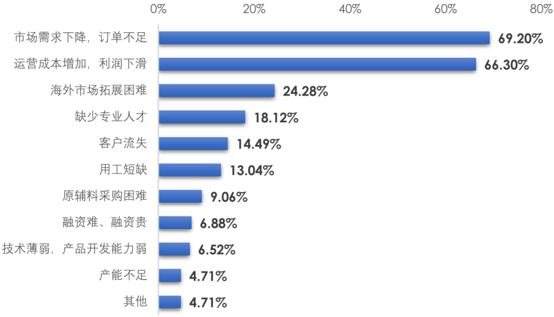 根據(jù)協(xié)會對會員企業(yè)的調(diào)研,市場需求下降和運營成本增加是當前受訪企業(yè)在經(jīng)營過程中面臨的主要困難,海外市場拓展困難、缺少專業(yè)人才和客戶流失也是企業(yè)反映較多的問題,見表3。
