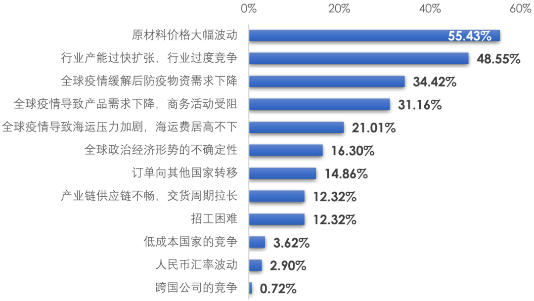 對于行業(yè)當前面臨的主要外部挑戰(zhàn),受訪企業(yè)反映的問題主要集中在原材料價格的大幅波動和行業(yè)產(chǎn)能的過快擴張,此外,防疫物資需求下降、商務(wù)活動受阻和海運費居高不下也是企業(yè)反映較多的問題(表4)。受訪企業(yè)對來自低成本國家的競爭普遍持比較樂觀的態(tài)度,企業(yè)對自身的產(chǎn)品質(zhì)量、客戶關(guān)系和創(chuàng)新能力有較強的信心,有信心和能力參與全球競爭。