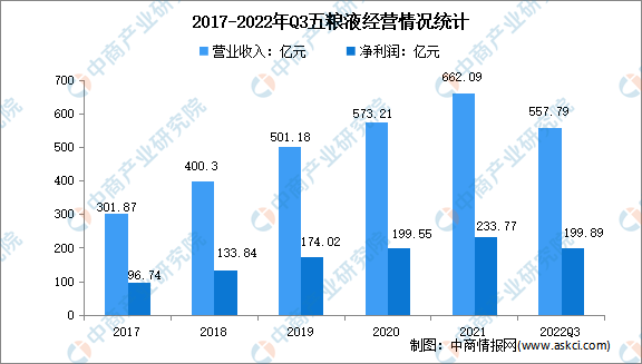 五糧液主要產(chǎn)品“五糧液酒”是我國(guó)濃香型白酒的典型代表。同時(shí),五糧液根據(jù)生產(chǎn)工藝特點(diǎn)開發(fā)了五糧春、五糧醇、五糧特曲、尖莊等品類齊全、層次清晰的系列酒產(chǎn)品。2021年,五糧液營(yíng)業(yè)收入達(dá)662.09億元,凈利潤(rùn)實(shí)現(xiàn)233.77億元。2022年前三季度實(shí)現(xiàn)營(yíng)業(yè)收入557.79億元,凈利潤(rùn)199.89億元。