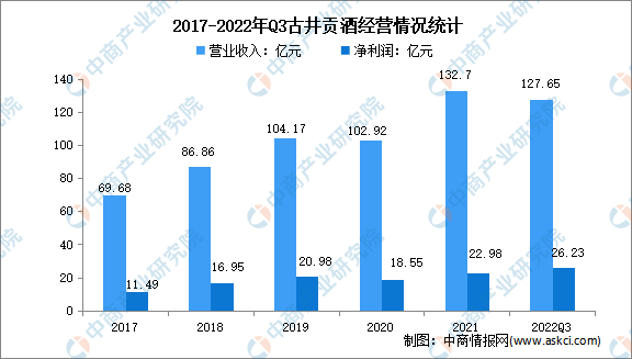 古井貢酒是中國(guó)老八大名酒企業(yè),是中國(guó)第一家同時(shí)發(fā)行A、B兩支股票的白酒類上市公司,坐落在世界十大烈酒產(chǎn)區(qū)之一的安徽省亳州市。2021年,古井貢酒營(yíng)業(yè)收入達(dá)132.7億元,實(shí)現(xiàn)凈利潤(rùn)22.98億元。2022年前三季度實(shí)現(xiàn)營(yíng)業(yè)收入127.65億元,凈利潤(rùn)26.23億元。
