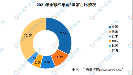 目前,中國已成為全球最大的汽車生產(chǎn)國。數(shù)據(jù)顯示,2021年中國汽車產(chǎn)量占世界總產(chǎn)量的32.5%;美國產(chǎn)量占比為11.4%,全球排名第二;此外,日本、印度和韓國的比重分別為9.8%、5.5%、4.3%,位列第3-5名。