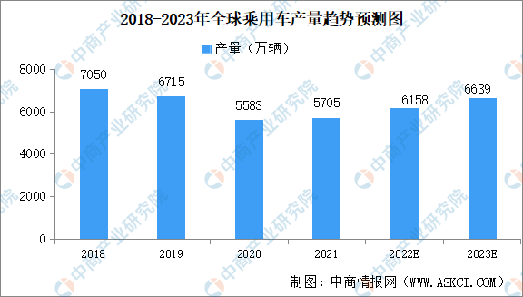 數(shù)據(jù)顯示,2018年至2020年全球乘用車產(chǎn)量呈現(xiàn)下滑趨勢,2021年隨著新冠肺炎疫情緩和,居民出行需求增加,乘用車產(chǎn)量出現(xiàn)增長,產(chǎn)量約為5705萬輛,同比增長2%。預計2022-2023年全球乘用車市場需求回暖加速,產(chǎn)量呈增長趨勢,到2023年全球乘用車產(chǎn)量將達6639萬輛。