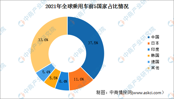 全球乘用車產(chǎn)量排在前5名的國家分別是中國、日本、印度、韓國和德國。其中,中國乘用車產(chǎn)量排名第一,占比高達37.5%,日本、印度、韓國和德國乘用車產(chǎn)量占比分別為11.6%、6.4%、5.5%和5.4%。