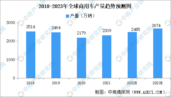 2018-2021年全球商用車(包括輕型商用車、重型卡車、客車巴士等)產(chǎn)量小幅波動。其中,受新冠肺炎疫情影響2020年全球商用車產(chǎn)量出現(xiàn)較大跌幅,產(chǎn)量降至2179萬輛。隨著世界工業(yè)生產(chǎn)與旅游業(yè)的逐步恢復,2021年全球商用車產(chǎn)量相較于乘用車漲幅較大,商用車產(chǎn)量約為2309萬輛,同比增長6%。預計2023年全球商用車產(chǎn)量將增至2674萬輛。