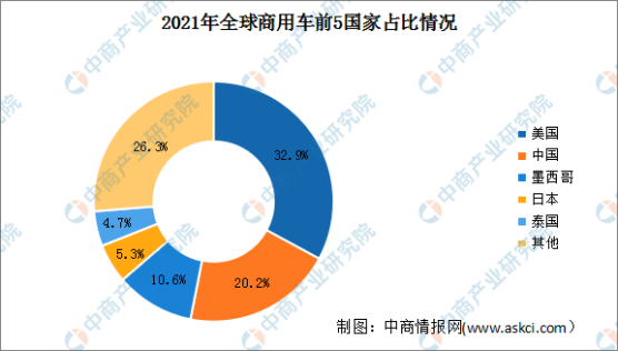 從國別來看,美國商用車產(chǎn)量占比最高,達32.9%;中國商用車產(chǎn)量全球第二,占世界總產(chǎn)量的20.2%。此外,墨西哥、日本和泰國,占比分別為10.6%、5.3%和4.7%。