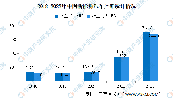 2022年12月,新能源汽車產(chǎn)銷繼續(xù)保持高速增長,再創(chuàng)歷史新高,分別達到79.5萬輛和81.4萬輛,同比均增長51.8%。2022年,新能源汽車產(chǎn)銷分別達到705.8萬輛和688.7萬輛,同比分別增長96.9%和93.4%。