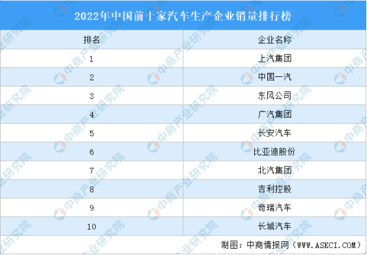 2022年,汽車銷量排名前十位的企業(yè)共銷售2314.8萬輛,占汽車銷售總量的86.2%。2022年前十家汽車生產(chǎn)企業(yè)分別為:上汽集團、中國一汽、東風公司、廣汽集團、長安汽車、比亞迪股份、北汽集團、吉利控股、奇瑞汽車、長城汽車。