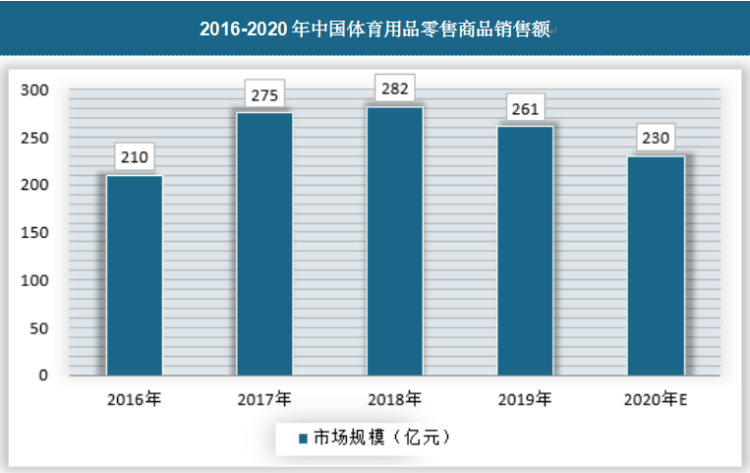 隨著政策利好、人民體育消費(fèi)需求的提高,我國體育用品行業(yè)的發(fā)展將進(jìn)入新時(shí)期。體育品牌分別針對消費(fèi)者的不同需求類型,拓展專項(xiàng)的運(yùn)動(dòng)用品市場,例如兒童、女性運(yùn)動(dòng)用品等。而跑步作為一項(xiàng)大眾體育運(yùn)動(dòng),近幾年跑步類產(chǎn)品更是需求增長迅猛。2016-2018年中國體育用品零售商品銷售額逐年增加,2019年中國體育用品零售商品銷售額達(dá)到261億元。新冠肺炎疫情對我國體育用品行業(yè)造成一定的影響,人們參與相關(guān)戶外體育活動(dòng)的大幅降低。預(yù)計(jì)2020年中國體育用品零售商品銷售額將達(dá)到230億元左右,具體如下: