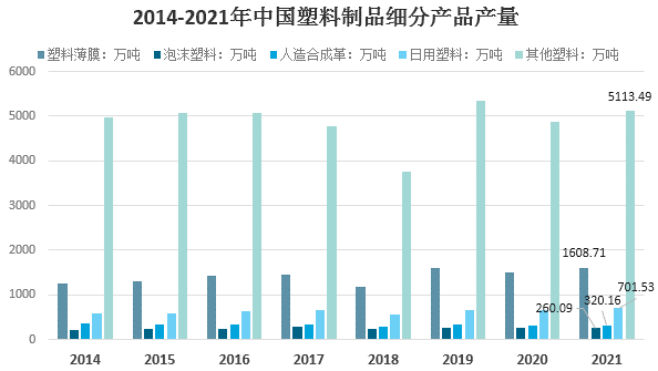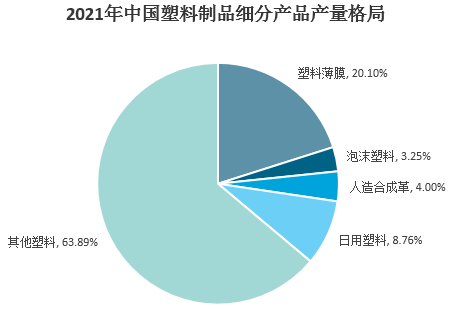 國內(nèi)塑料制品產(chǎn)品門類眾多,從細(xì)分市場來看,2021年我國塑料薄膜產(chǎn)量1608.71萬噸,占比20.1%;日用塑料產(chǎn)量701.53萬噸,占比8.76%;人造合成革產(chǎn)量320.16萬噸,占比4%;泡沫塑料產(chǎn)量260.09萬噸,占比3.25%;其它塑料產(chǎn)量5113.49萬噸,占63.89%。