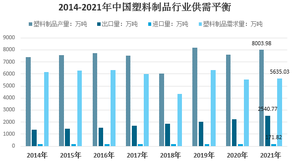 根據(jù)海關(guān)數(shù)據(jù),2021年我國塑料制品行業(yè)進(jìn)口171.82萬噸,出口2540.77萬噸,結(jié)合國內(nèi)產(chǎn)量來看,2021年我國塑料制品行業(yè)表觀需求量達(dá)到5635.03萬噸。
