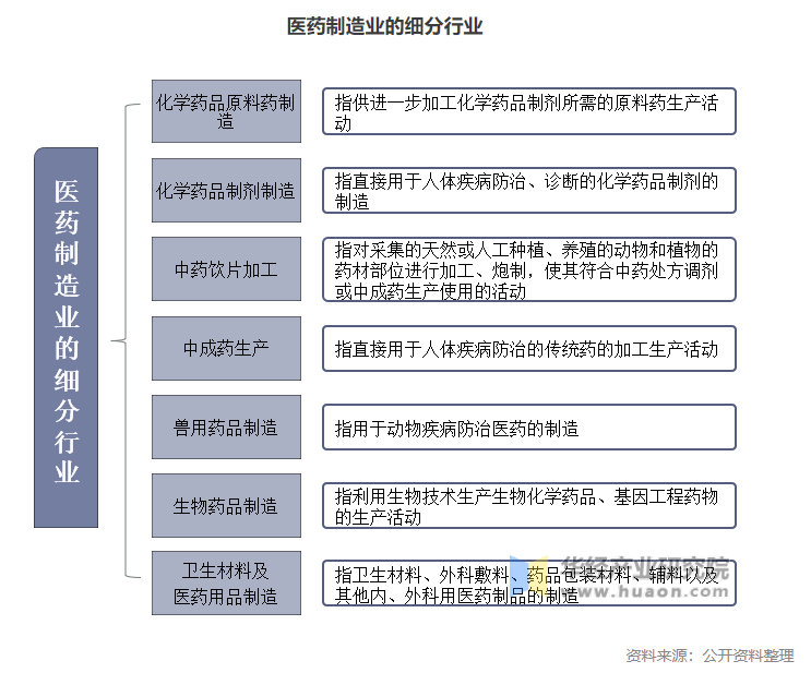 2、細(xì)分行業(yè):醫(yī)藥制造業(yè)具體可以細(xì)分為化學(xué)藥品原料藥制造、化學(xué)藥品制劑制造、中藥飲片加工、中成藥生產(chǎn)、獸用藥品制造、生物藥品制造和衛(wèi)生材料及醫(yī)藥用品制造七個(gè)行業(yè)。我國(guó)醫(yī)藥制造企業(yè)是指以藥品研發(fā)、生產(chǎn)及銷售為主的企業(yè)。根據(jù)具體藥品生產(chǎn)業(yè)務(wù)線的不同,《中國(guó)高技術(shù)產(chǎn)業(yè)統(tǒng)計(jì)年鑒》將我國(guó)醫(yī)藥制造業(yè)分為三大種類:化學(xué)藥品制造、生物藥品制造和中成藥制造。