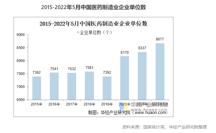 疫情前,受政策控制和行業(yè)嚴(yán)格監(jiān)管的影響,我國(guó)醫(yī)藥制造業(yè)企業(yè)單位數(shù)量較為穩(wěn)定,研發(fā)能力較弱的中小型企業(yè)逐漸退出市場(chǎng),2020年疫情席卷全球,市場(chǎng)迫切需要大量藥品和疫苗研發(fā),企業(yè)數(shù)量開始增長(zhǎng),截止2022年5月我國(guó)醫(yī)藥制造業(yè)企業(yè)有8677家。