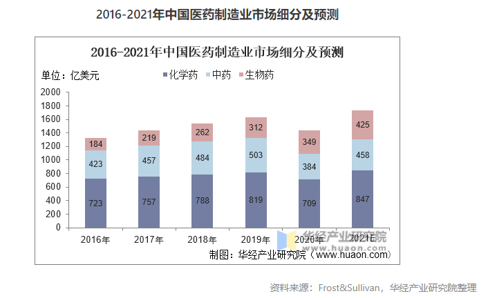 醫(yī)藥制造業(yè)三大種類中,化學(xué)藥的市場(chǎng)占比最多,化學(xué)藥主要用于人體疾病防治、診斷。應(yīng)用領(lǐng)域較為廣泛和普及,2020年我國(guó)化學(xué)藥市場(chǎng)規(guī)模大709億美元,占比49.2%;生物藥憑借其藥理活性高、特異性強(qiáng)、治療效果好等特點(diǎn),越來越受市場(chǎng)關(guān)注,其市場(chǎng)規(guī)模由2016年的184億美元增長(zhǎng)至2020年的349億美元。慢性病的治療周期較長(zhǎng),我國(guó)中藥在慢性病的治療中具有不可替代的作用,2021年我國(guó)中藥制造企業(yè)規(guī)模預(yù)計(jì)為458億美元。