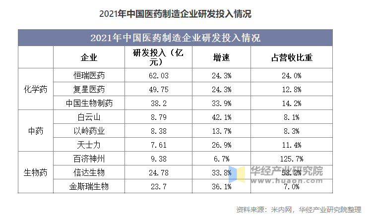 隨著藥品審評(píng)審批制度改革、國(guó)家醫(yī)保常態(tài)化調(diào)整等政策改革,“創(chuàng)新”逐漸成為藥企的發(fā)展理念。化學(xué)制藥行業(yè)正在發(fā)生結(jié)構(gòu)性變化,隨著仿制藥出現(xiàn)藥品價(jià)格持續(xù)下降的同時(shí),行業(yè)集中度也有望提升;中醫(yī)藥行業(yè)政策利好不斷,相關(guān)部門從市場(chǎng)準(zhǔn)入、醫(yī)保支付、審評(píng)審批等多個(gè)維度對(duì)中醫(yī)藥行業(yè)形成政策支撐,中藥原材料價(jià)格上漲對(duì)企業(yè)決策也造成一定的影響;生物藥雖然起步晚于化學(xué)藥,但近年來卻受全球藥企熱捧,成為藥企和投資者競(jìng)爭(zhēng)的新方向,研發(fā)投入力度較大。