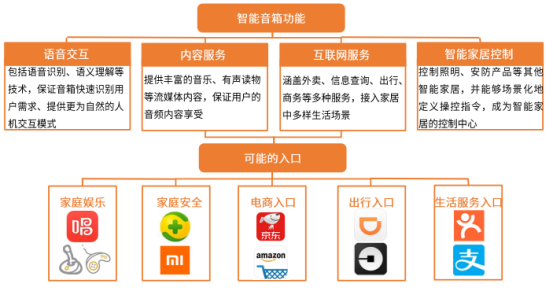 智能音箱是一款將多項人工智能技術(shù)進行創(chuàng)新融合的具備智能語音交互系統(tǒng)、內(nèi)容以及互聯(lián)網(wǎng)服務(wù)內(nèi)容,同時,又可以擴展更多設(shè)備、內(nèi)容接入的智能終端產(chǎn)品。目前,我國智能音箱的主要功能包括內(nèi)容娛樂服務(wù)、智能家居控制、語音交互、互聯(lián)網(wǎng)服務(wù)及內(nèi)容接入等功能。