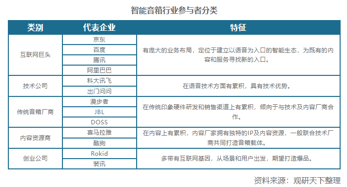 2011年美國(guó)亞馬遜開(kāi)始了智能音箱的研發(fā),并于2014年發(fā)布了Echo智能音箱,由此智能音箱行業(yè)起步發(fā)展。隨后谷歌、蘋(píng)果等相繼發(fā)布智能音箱產(chǎn)品,行業(yè)進(jìn)入爆發(fā)式增長(zhǎng)階段。2015年京東聯(lián)合科大訊飛推出的叮咚智能音箱則是國(guó)內(nèi)智能音箱行業(yè)的先行者,此后隨著行業(yè)向好,參與者不斷增多,主要分為互聯(lián)網(wǎng)巨頭、技術(shù)公司、傳統(tǒng)音箱廠商、內(nèi)容資源商、創(chuàng)業(yè)公司五大類(lèi)。