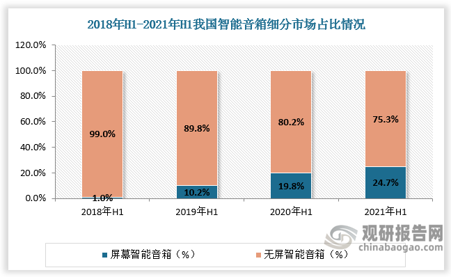 從細(xì)分市場(chǎng)看,智能音箱分為屏幕音箱和無(wú)屏音箱,近年來(lái)隨著智能音箱技術(shù)水平提升,產(chǎn)品智能程度提高,屏幕音箱占比逐漸提升,2021年H1達(dá)24.7%,較2018年H1增長(zhǎng)23.7個(gè)百分點(diǎn)。