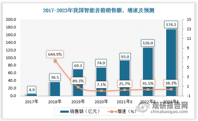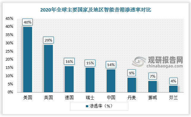 2017-2020年,國(guó)內(nèi)智能音箱市場(chǎng)零售額由4.9億元增長(zhǎng)至74億元,2021年H1我國(guó)智能音箱行業(yè)市場(chǎng)規(guī)模達(dá)46.5億元,較上年同期增長(zhǎng)30.6%,我國(guó)智能音箱進(jìn)入迅猛增長(zhǎng)階段。但從滲透率來(lái)看,2020我國(guó)智能音箱滲透率(14%)排名全球第五,銷(xiāo)售規(guī)模仍有較大的提升空間。未來(lái),隨著智能音箱廠商向下沉市場(chǎng)拓展,預(yù)計(jì)2023年我國(guó)智能音箱銷(xiāo)售額達(dá)到174.2億元。